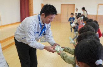機械設計などを手がけるメニックス(近江八幡市西庄町)が1月7日、ありす保育園(西本郷町)に、滋賀県の名所や歴史、特産品を題材にした「滋賀コレかるた」を贈呈した。