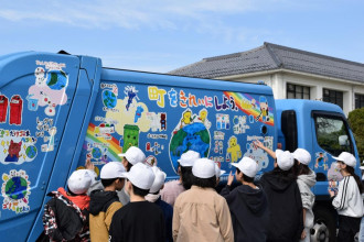 ごみ収集などの環境インフラサービスや環境分析を手がける日吉(近江八幡市北之庄町)が3月9日、八幡小学校で同校4年生が描いた絵をデザインしたパッカー車のお披露目会を行った。