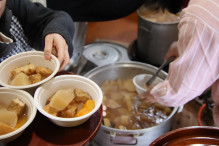 式典後には内覧会を行い、参加者は3班に分かれて施設内を見学した。小田町で初めて喫茶店を開いた「winooski(ウィノスキー)」の今井明彦さんが、紅茶やひきたてのコーヒーを振る舞い、和やかな交流の時間となった。会食では、鶏飯やおでんのほか、アユ、モロコ、ビワマスの煮物などを提供。来場者の一人は「懐かしい味がする」と話していた。