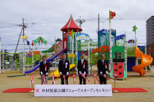 同日行われたオープニングセレモニーで、近江八幡市の小西理市長は「子どもたちと楽しく輪になって暮らすための環境づくりの一環として再整備した」と離し、都市整備部長の小林良孝さんは「子どもから高齢者まで地域のみんなでつくっていく公園」をコンセプトに整備したと説明した。来賓祝辞や事業概要の説明のほか、テープカットが行われ、供用開始を祝った。