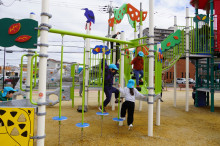 園内には、幼児用・児童用・インクルーシブ遊具を備えた「遊び広場」、約4000平方メートルの「芝生広場」、イベント利用が可能な約1000平方メートルの「イベント広場」、直径約12メートルの大屋根を備えた休憩所「集いの広場」などを整備。健康遊具や1周約350メートルのウオーキング・ジョギングコースとストレッチなどができる健康遊具も設け、多世代が利用できる空間とした。