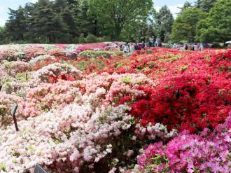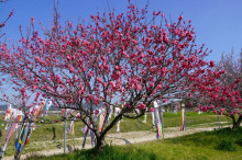 川沿いでは竜王町ライオンズクラブが2010(平成22)年から植栽してきた約155本のハナモモの開花も始まっている。見頃は4月中旬で、濃い桃色や淡い色、白、まだら入りなど多様な色が楽しめる。見頃を迎えても約1週間は色味を保ち、4月下旬にかけて散る見込み。
