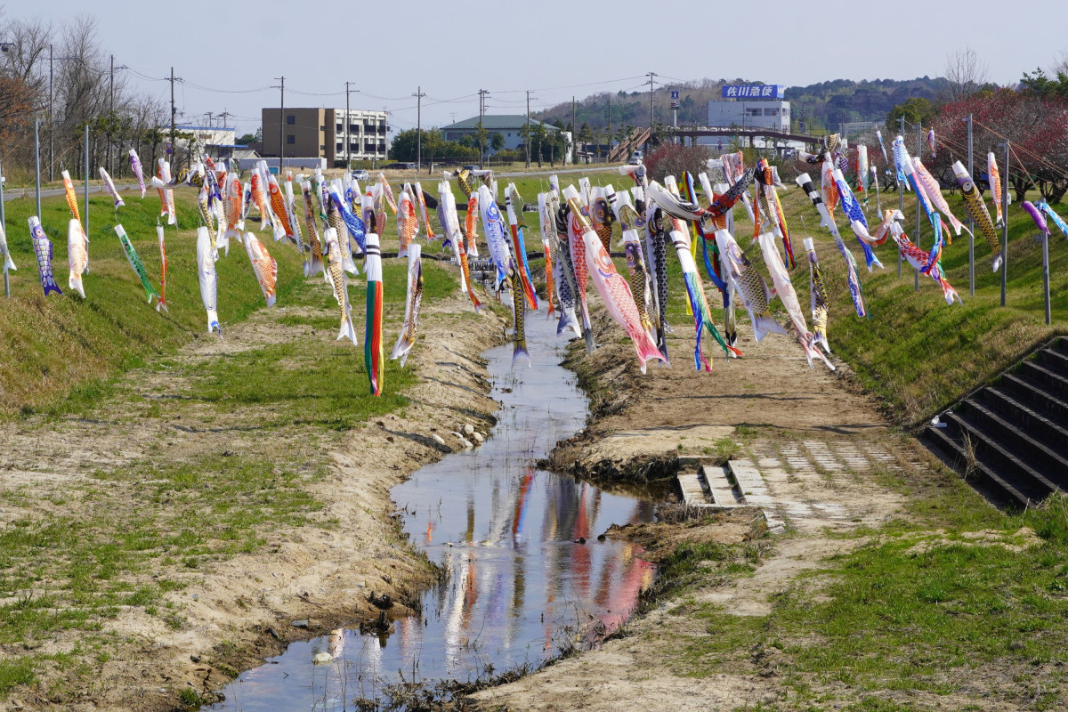 竜王町を流れる善光寺川の山面大橋付近(竜王町山面)に現在、約100匹のこいのぼりが掲げられている。