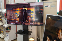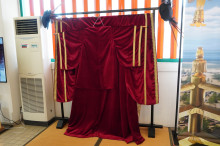 2つ目は、織田信長の衣装を再現した体験コーナー。ドラマで織田信長役の吉川晃司さんが着用したマントと帽子の複製で、大人用と子ども用の2種類を用意した。背景には城下町と琵琶湖を望む風景パネルを設け、着用して写真撮影ができるようにした。体験料は大人=500円、小人=300円。