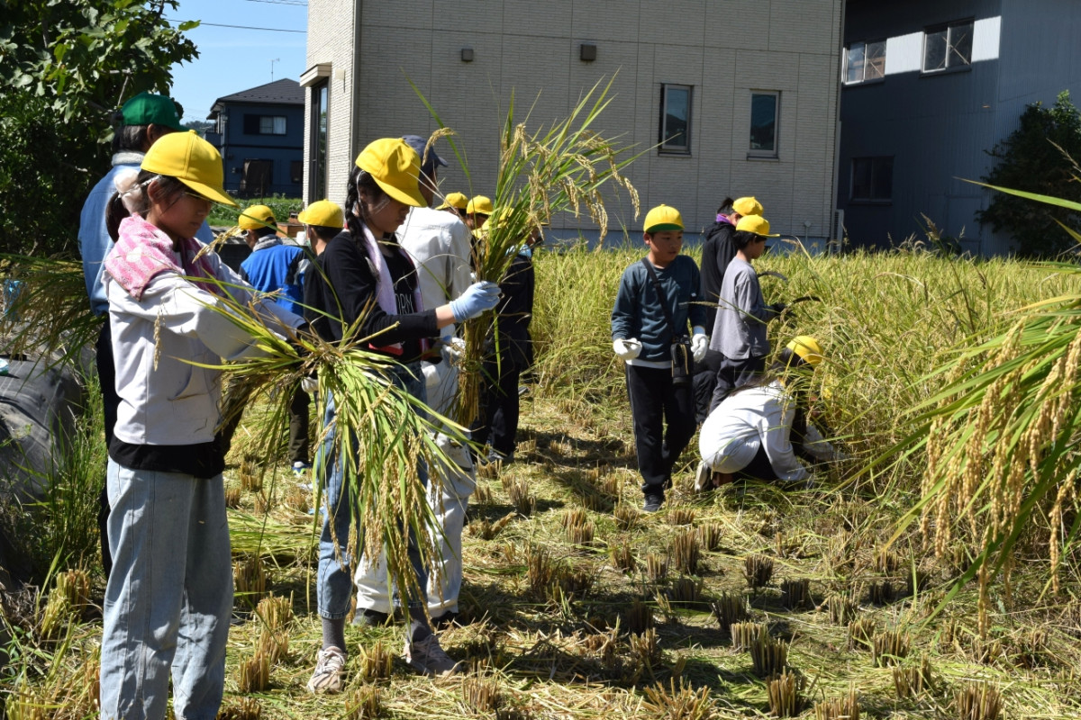 竜王町小学校(竜王町綾戸)の5年生52人が9月22日、稲刈り体験を行った。
