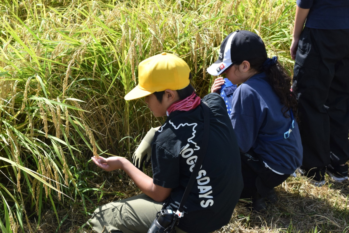 竜王町小学校(竜王町綾戸)の5年生52人が9月22日、稲刈り体験を行った。