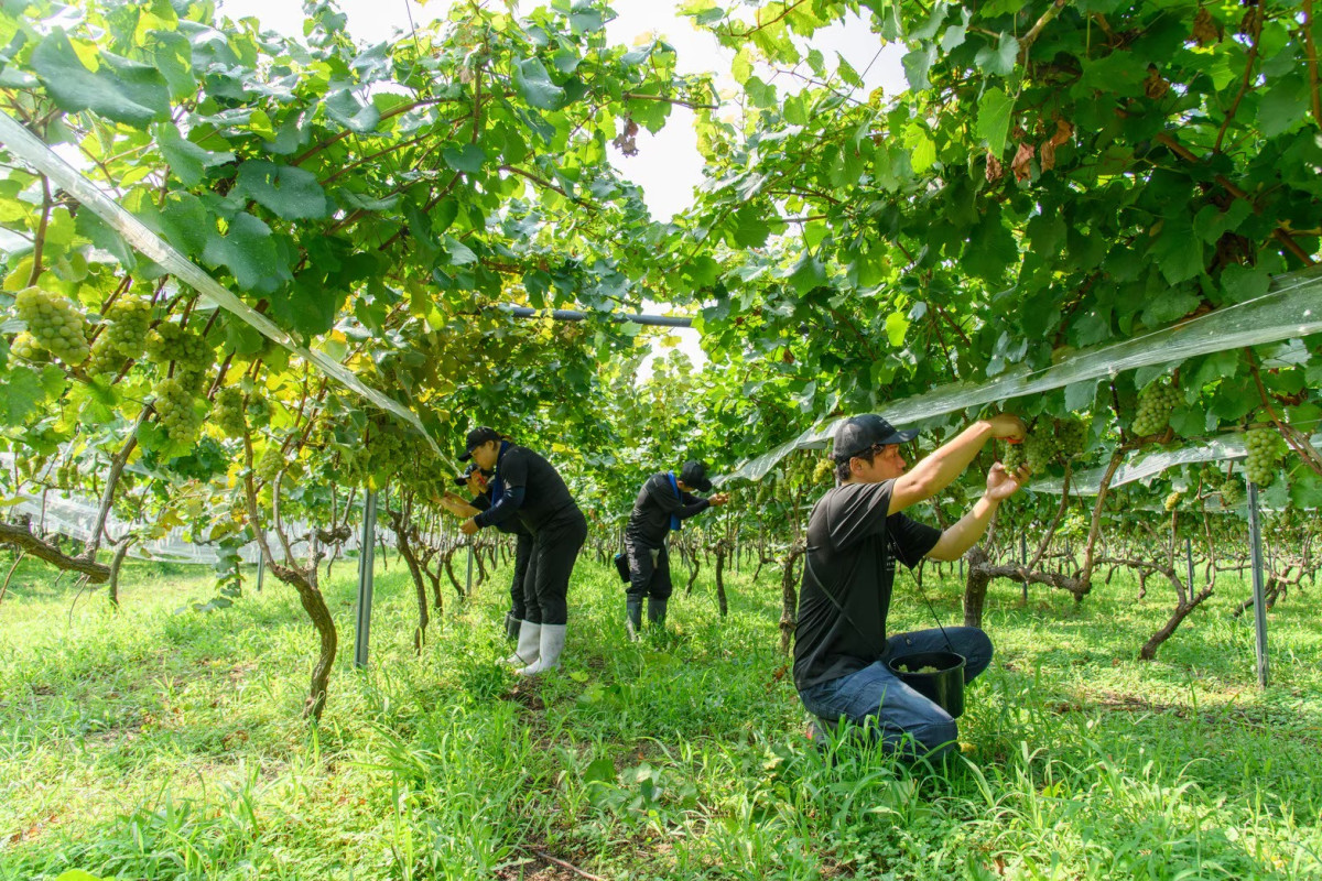 ブドウを収穫するスタッフ(写真提供=空色ワイナリー)