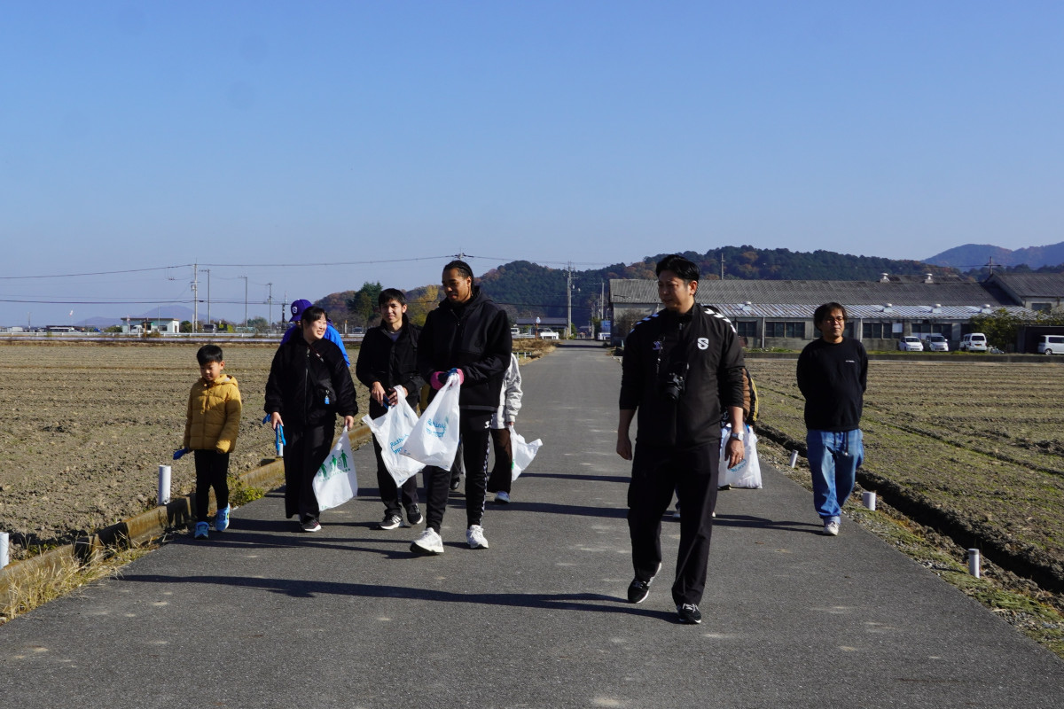 滋賀レイクスの江原選手とファンが西の湖周辺の農道を歩いてごみを拾った