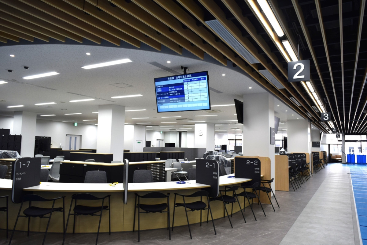 近江八幡市は12月12日、桜宮町で整備を進めてきた市役所新庁舎の報道向け内覧会を行った。