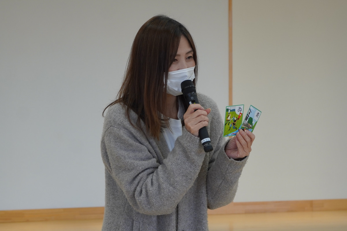 読み札を読む「滋賀コレかるた」の大田千菜美さん