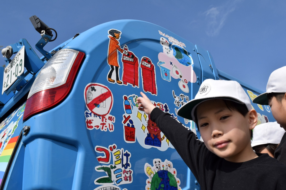 ごみ収集などの環境インフラサービスや環境分析を手がける日吉(近江八幡市北之庄町)が3月9日、八幡小学校で同校4年生が描いた絵をデザインしたパッカー車のお披露目会を行った。