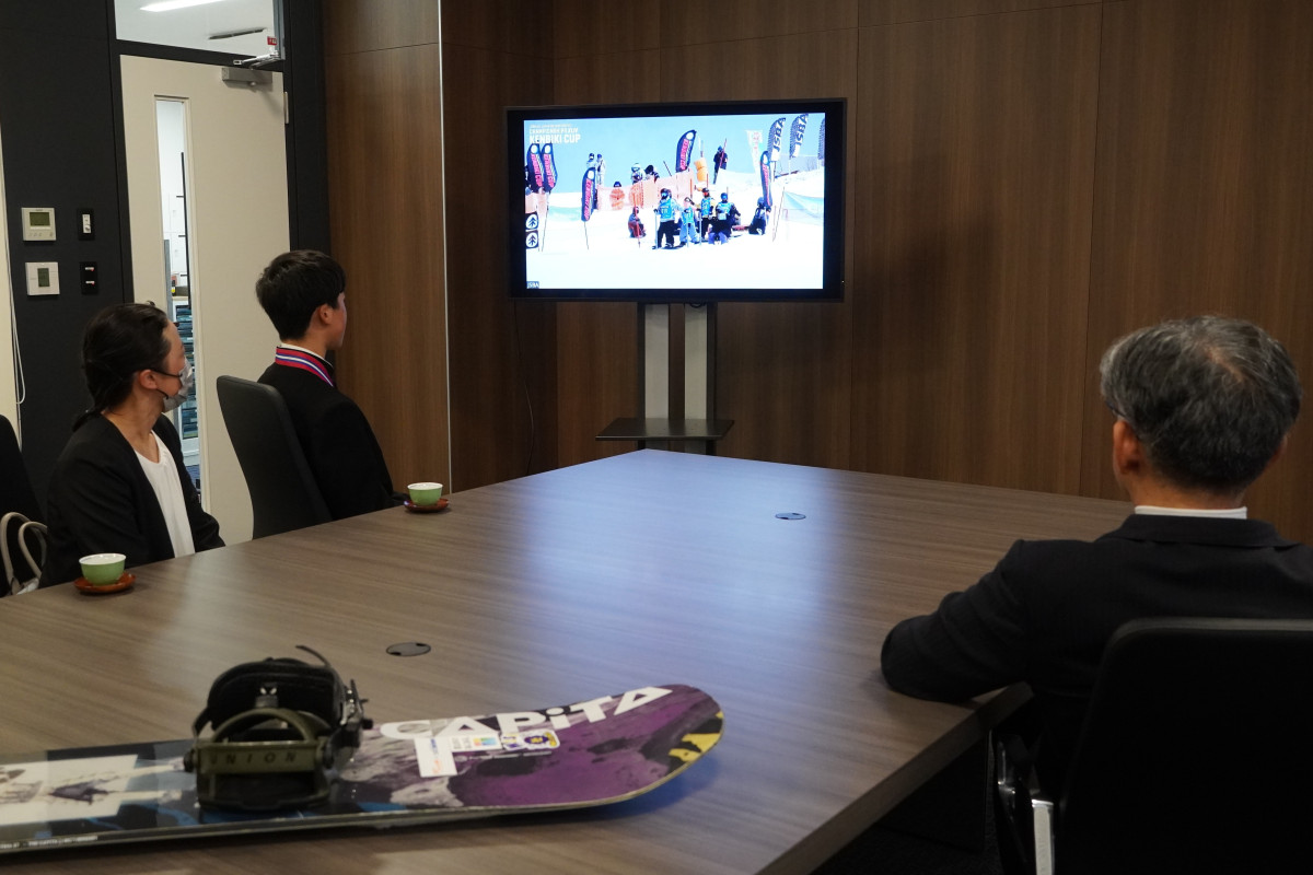 近江八幡市在住の中学1年生、重松春翔さんが3月24日、近江八幡市役所(近江八幡市桜宮町)を訪れ、スノーボードの全国大会で3位に入賞したことを小西理市長に報告した。