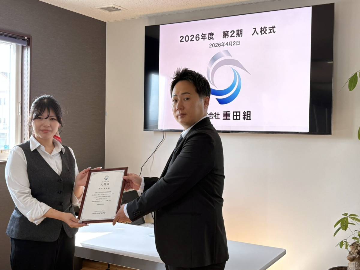 社内研修制度「土木大学校」の入校式が4月2日、建設会社・重田組(近江八幡市若宮町)で行われた。