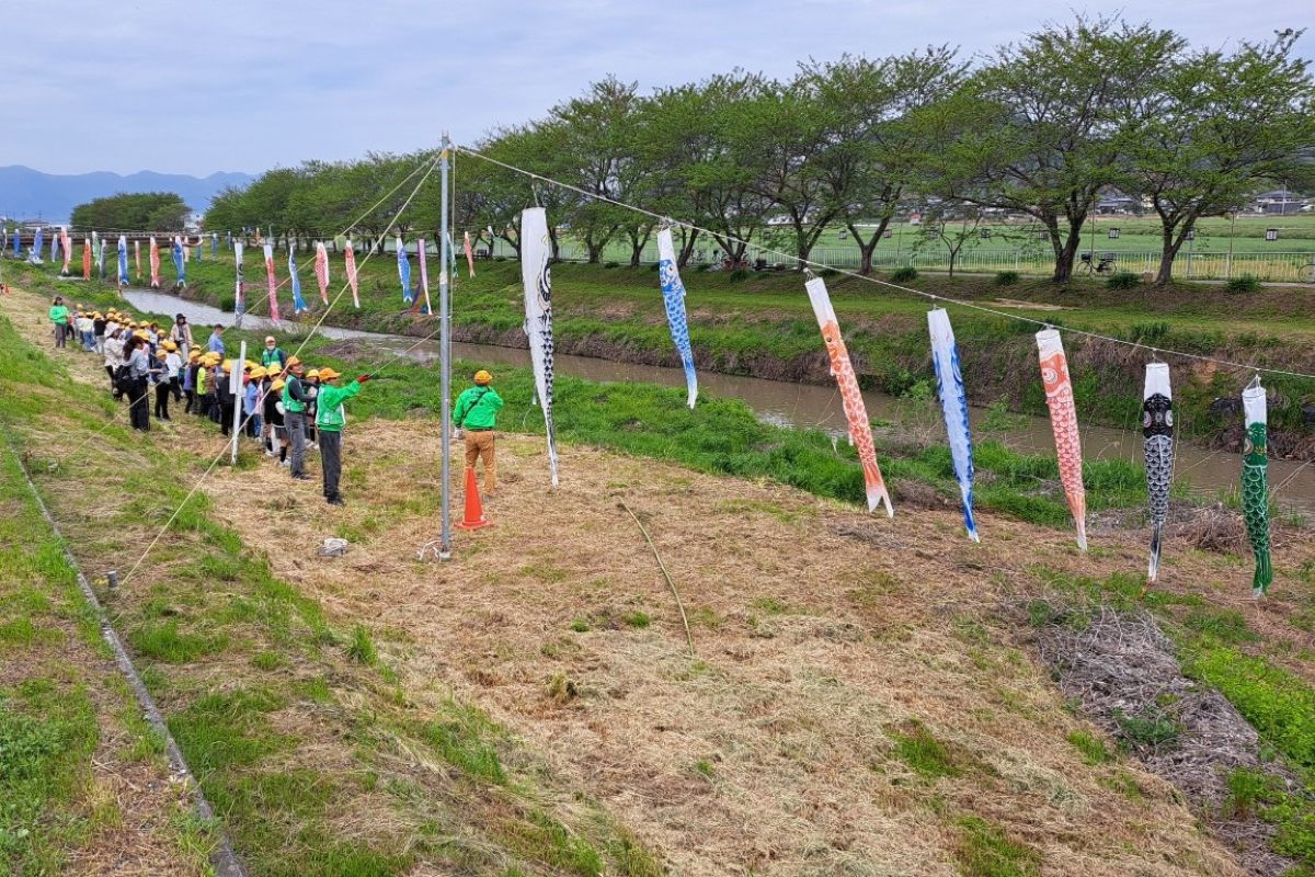 こいのぼりを上げる桐原東小学校の児童(写真提供=白鳥川の景観をよくする会)