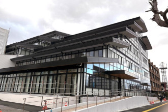 近江八幡市は12月12日、桜宮町で整備を進めてきた市役所新庁舎の報道向け内覧会を行った。